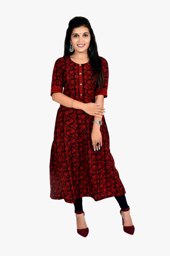 sunayra Women Printed Pure Cotton Flared Kurta (Maroon)
