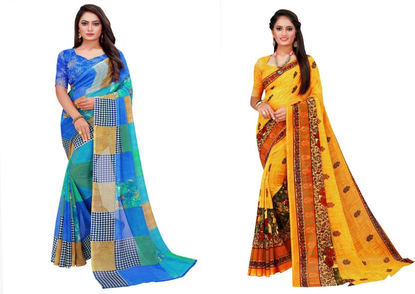 Geometric Print Daily Wear Georgette Saree (Pack of 2, Blue)