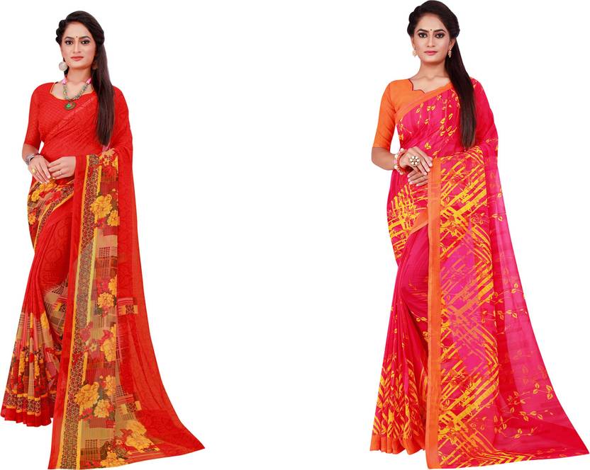 Saadhvi Women's Georgette Red Multicolor Printed Combo Saree With Unstithed Blouse