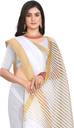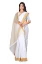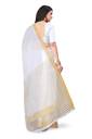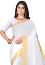 This kerala kasavu white saree, which captures the essence of the rich textile legacy of India, is accented with hues of gorgeous golden zari on the border and pallu. With this stunning drape, discover simplicity wrapped in timeless style. Put on the beauty and glitz of Kerala kasavu this Onam. The mundum neriayathum, the traditional dress of Keralan ladies, is enjoying a resurgence in popularity.