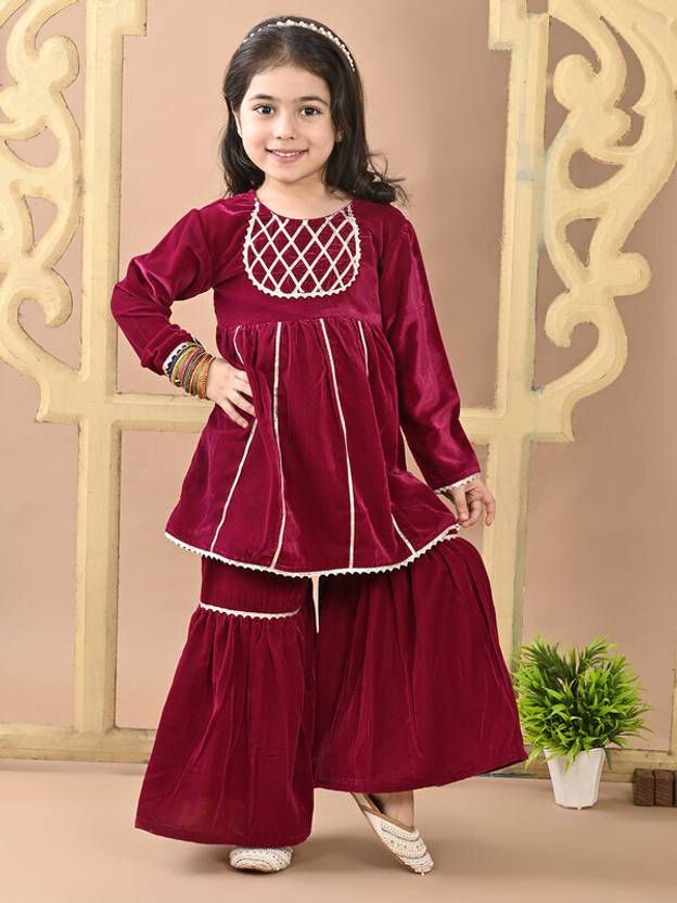 Style: Sharara Kurti showcases a timeless design with a round neck and full sleeves, offering a ideal blend of modesty and elegant. The graceful silhouette is complemented by the velvet fabric. Bottom has elasticated waistband.Print/Pattern: Classic solid design, kurti is enhanced with intricate lace ornamentation adding a touch of elegance and refinement.