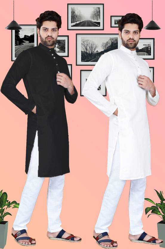 SURATILALA Pack of 2 Men Solid Cotton Blend Straight Kurta (Black, White)