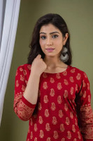 Boasting three-quarter sleeves and a round neck design, the kurta from this set can provide a contemporary twist to a traditional silhouette. Its three-quarter sleeves offer comfort, allowing free movement, and its round neck can create an effortlessly chic look. Thus, you can experience the benefit of feeling both relaxed and fashion-forward in this attire.