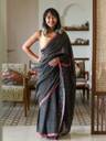 This saree is by Suta Pvt. Ltd. It is made from Pure Cotton Fabric and finished in Black Color. The length of the saree is 5.5 meters ; Width: 47 inches. The saree does not come with a blouse piece.