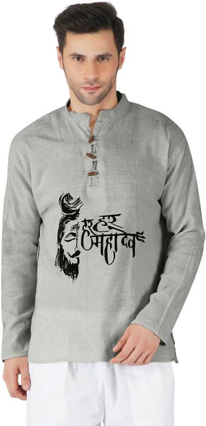 Men Printed Hemp Straight Kurta (Grey, Black)