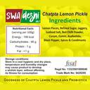 | Ingredients | - Lemon Pieces, Refined Sugar, Jaggery, Lodised Salt, Red Chilli Powder, Curum, Cumin, Asafoetida, Black Pepper, Spices & Condiments