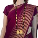 The chain is made up of tiny crystal beads that shimmer and sparkle in the light, creating a mesmerizing effect. The centerpiece of the mangalsutra is a large pendant that is intricately designed with traditional Marathi motifs.