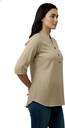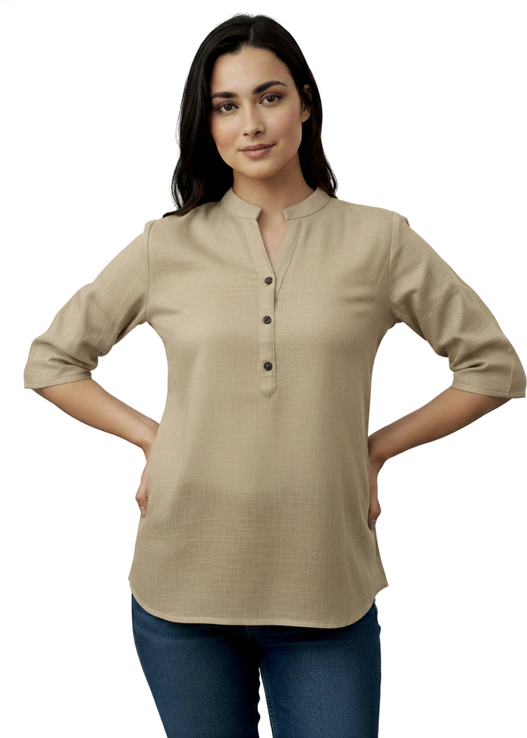 Keep your look simple yet stylish with this women’s beige solid cotton kurti, designed for effortless everyday wear. Made with breathable cotton fabric, it ensures comfort throughout the day while giving you a refined appearance. Featuring a straight cut waist-length design, mandarin collar, and 3/4 sleeves, this kurti offers a classic yet modern appeal. The neutral beige shade makes it versatile to style with jeans, leggings, or palazzos, making it suitable for office wear, college, or casual outings. With its pull-on closure and button detail, this kurti is a must-have for women who love comfort and minimal elegance.