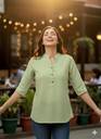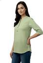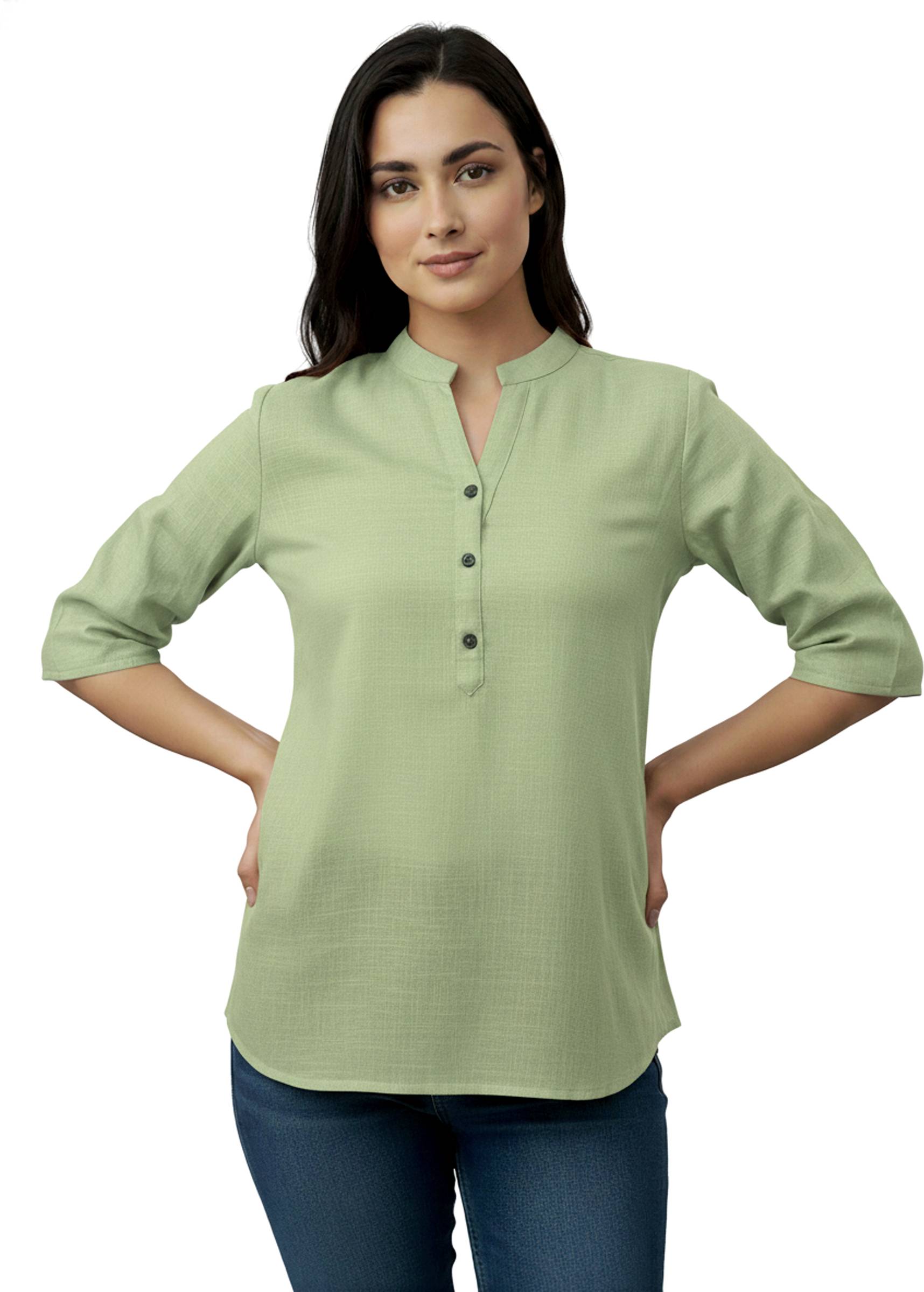Step out in style with this women’s sea green solid cotton kurti, tailored for both comfort and elegance. Made from soft, breathable cotton, this kurti features a straight fit waist-length design that flatters every body type. The mandarin collar with 3/4 sleeves adds a smart and trendy touch, while the solid sea green shade makes it versatile for pairing with jeans, leggings, or palazzos. Designed with a pull-on closure and button detail, it’s an easy-to-wear outfit perfect for casual outings, college, or office wear.