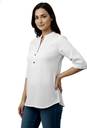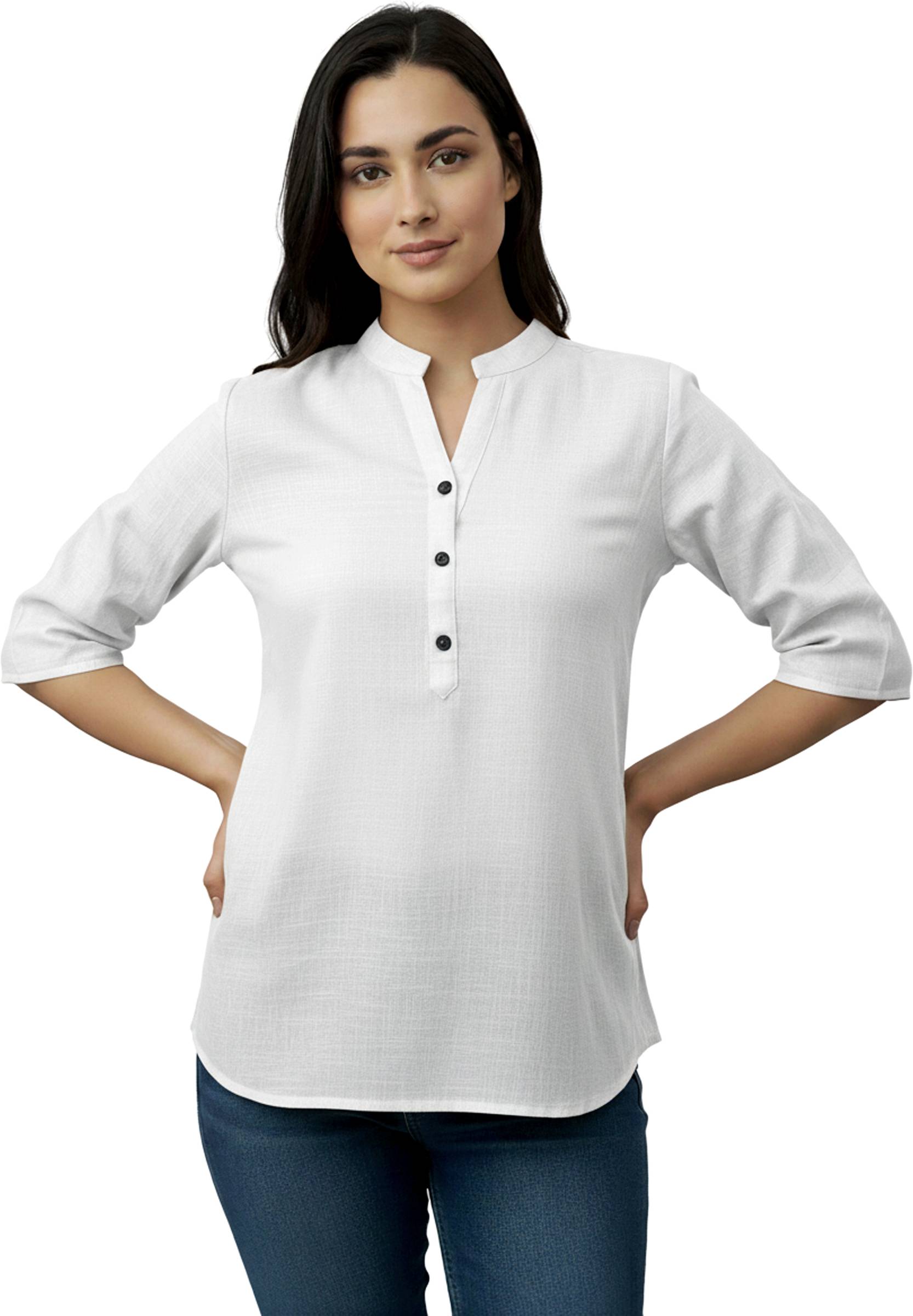 Keep it classic with this women’s white solid cotton kurti, a wardrobe essential that blends comfort with timeless elegance. Made from soft, breathable cotton, it ensures all-day ease while keeping your style refined. Designed in a straight cut waist-length fit with a mandarin collar and 3/4 sleeves, this kurti is versatile enough for both casual and semi-formal occasions. The solid white shade makes it easy to pair with colorful leggings, jeans, or palazzos, giving you endless styling options. With its pull-on style and button detailing, this kurti is the perfect go-to piece for college, office, or everyday wear.