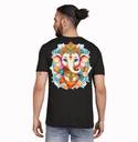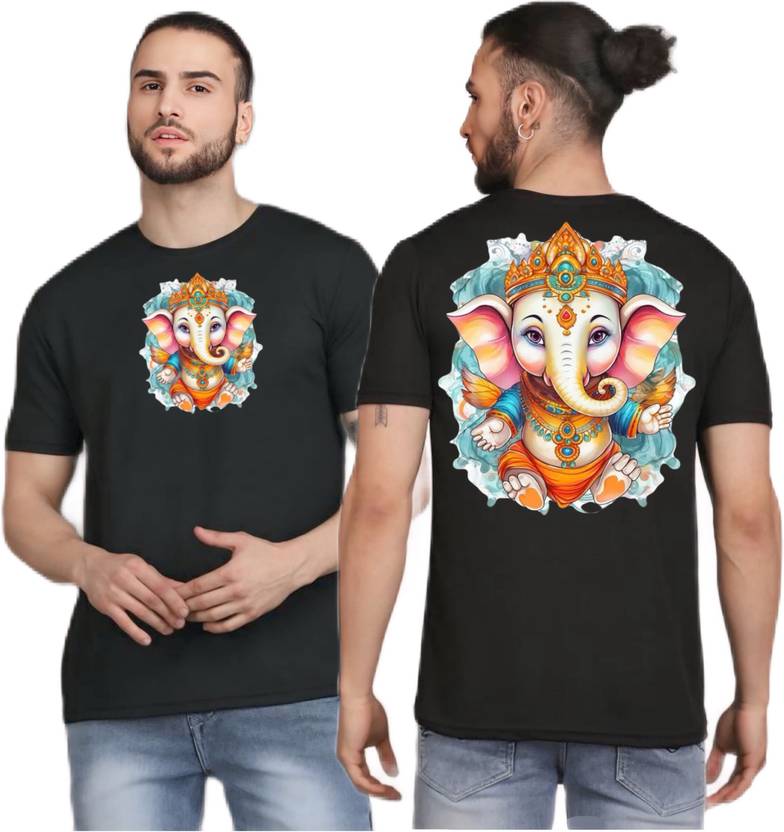 This T-shirt is made from high-quality, soft, and breathable black cotton, offering comfort and durability. The design showcases a vibrant and intricately detailed image of Lord Ganapathi, the elephant-headed deity revered in Hindu culture as the remover of obstacles and the god of beginnings. The Ganapathi design may include traditional elements such as his large ears, trunk, and multiple arms holding various symbolic objects, all rendered in a blend of colors like gold, red, and green to create a striking contrast against the black fabric. The intricate detailing, from the deity's ornate headdress to the symbolic items in his hands, adds a spiritual and artistic touch, making this T-shirt a perfect blend of contemporary fashion and cultural heritage.