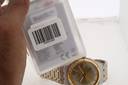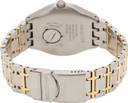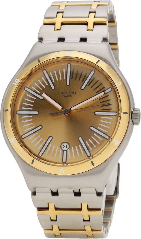 Stainless steel case with a two-tone (silver and gold-tone) stainless steel bracelet. Fixed gold-tone bezel. Gold dial with gold-tone hands and index hour markers. Minute markers around the outer rim. Dial Type: Analog. Luminescent hands and markers. Date display at the 6 o'clock position. Chronograph - three sub-dials displaying: 60 second, 30 minute and 1/10th of a second. Quartz movement. Scratch resistant mineral crystal. Pull / push crown. Solid case back. Case diameter: 41 mm. Case thickness: 11 mm. Round case shape. Band width: 20 mm. Fold over clasp with safety release. Water resistant at 30 meters / 100 feet. Casual watch style. Swatch Ride In Gold Dial Two-tone Men's Watch YWS410G
