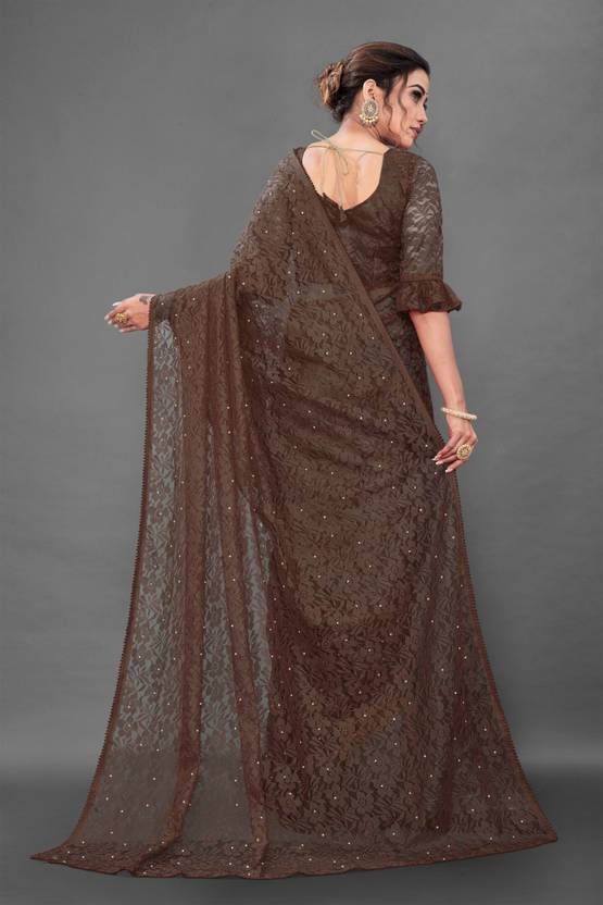 Paanthcreation Floral Print Bollywood Net Saree (Brown)