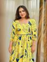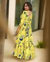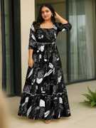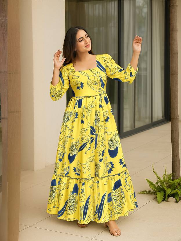 Elegant Design: Square neck style offer a contemporary look with a flattering silhouette, perfect for sunny days and casual outings., Premium Rayon Fabric: Made with high-quality, breathable rayon that ensures softness, comfort, and durability throughout the day., Vibrant Floral Print: Features a striking white floral print on a soothing blue base, giving the dress a fresh and tropical beach vibe., Flared Tiered Hem: Ankle-length dress with a voluminous tiered hemline that adds graceful movement and enhances its airy, flowy design.