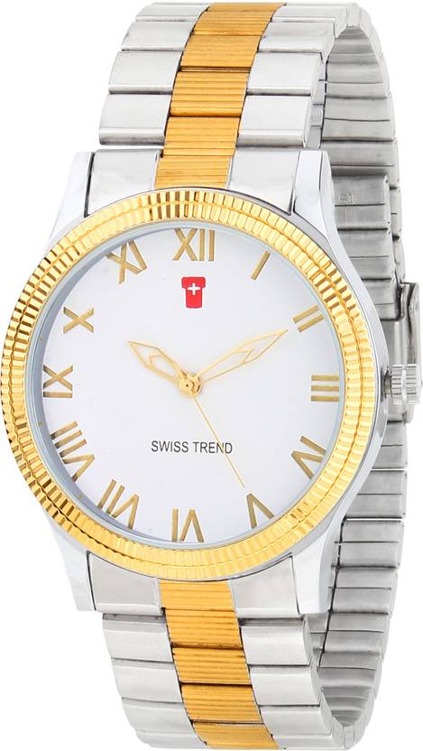 Swiss Trend Steel Gold wrist Watch with white dial watch made from high quality Stainless steel. It has Stainless steel back and chain. It has an elegant look and will create a style statement each time you wear it This is a great watch for all occasions and will go well with your formal and party wear dresses. It comes with a 1 year warranty against manufacturing defects, so you can buy with full confidence.