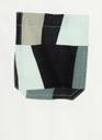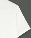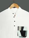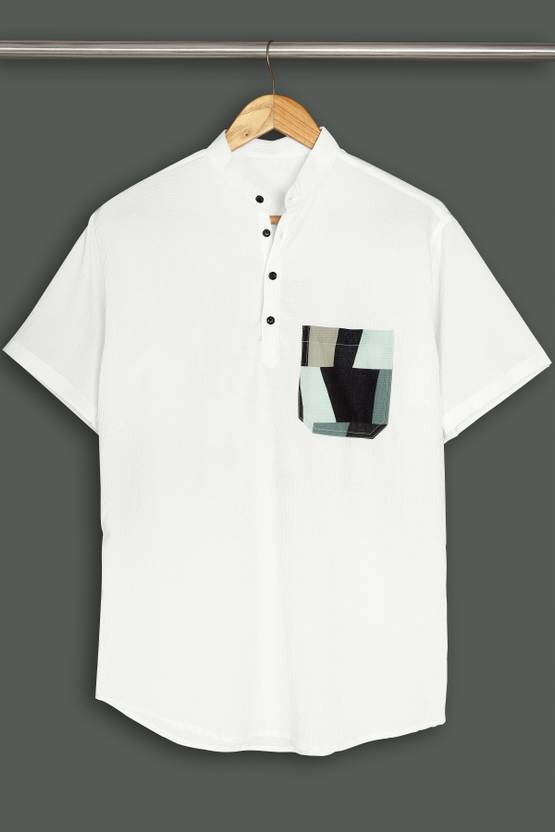 The image depicts a short-sleeved white shirt with a mandarin collar and four black buttons in the front. The shirt features a single pocket on the left chest with a distinct zigzag pattern in shades of green and brown, giving it a subtle, geometric look. The fabric appears to have a textured or slightly woven appearance. The design is simple yet stylish, blending modern and minimalistic elements with a touch of detail in the patterned pocket.