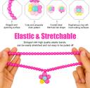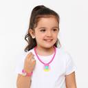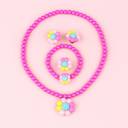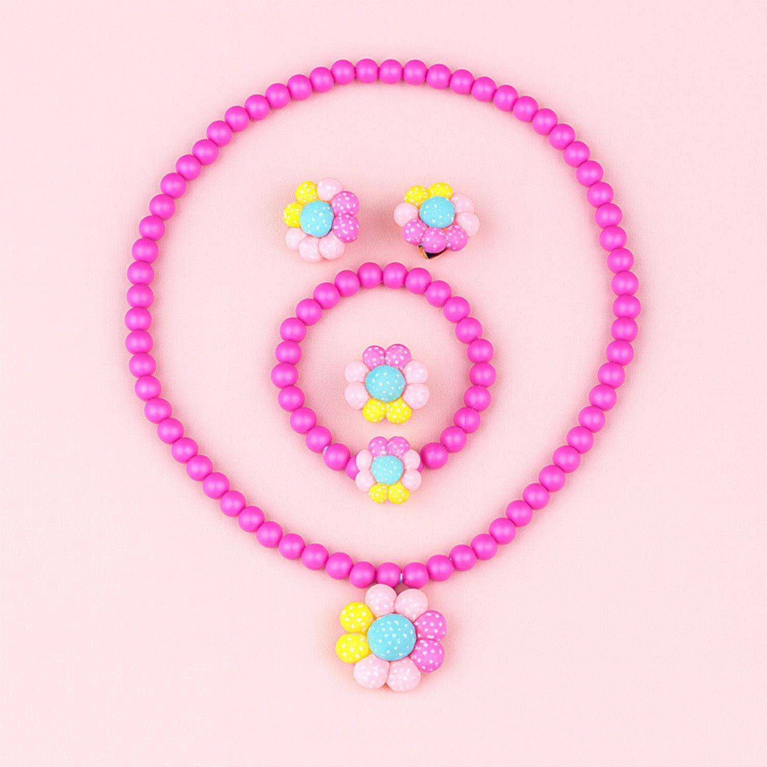 This vibrant kids' jewelry set includes a matching necklace, bracelet, ring and pair of clip-on earrings, all crafted with bright pink beads and colorful flower pendants. Each piece features a cheerful floral design in pink, yellow, and green, making it a playful accessory for any outfit. Made from non-toxic, durable plastic, the set is safe for children and comfortable to wear. Perfect for dress-up, parties, or everyday fun, this jewelry set adds a splash of color and charm to any look.