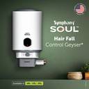 The Symphony Soul, a geyser designed for hair fall control in India. It features the PUROPOD, a replaceable cartridge that filters impurities and softens hard water, ensuring that the water is safe for hair and skin. The geyser includes a Titanium Pro Glassline Coating and a heavy-duty magnesium rod for protection against corrosion. The Incoloy glass-coated heating element is designed for durability and resists corrosion. Safety features include a thermal cutout, safety valve, and ELCB to help prevent overheating and electrical faults. It is available in 10L, 15L, and 25L capacities to accommodate different household needs.