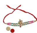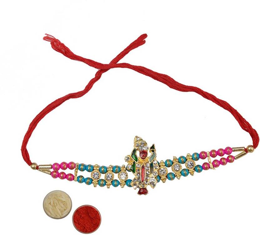 Rakhi is a thread that unites the countless emotions like promise, protection & love of a brother and a sister for eternal times. So celebrates this rakhi with Taj Pearl Rakhi Products. We presents this beautiful Rakhi to lead a grace on the arm of your dear brother with all the affection and love of a sister. So grab it today. Limited stock. This Rakhi is made of Alloy, Rope which is further studded with Crystals and synthetic beads. Packed in Poly Pack which is further packed in durable plastic box for safe delivery. Comes with roli and Tika.