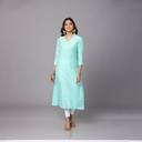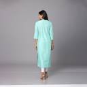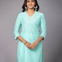 A pista green colored South Silk A line kurti with quarter sleeves and shaped v neck, embellished with machine embroidery details.