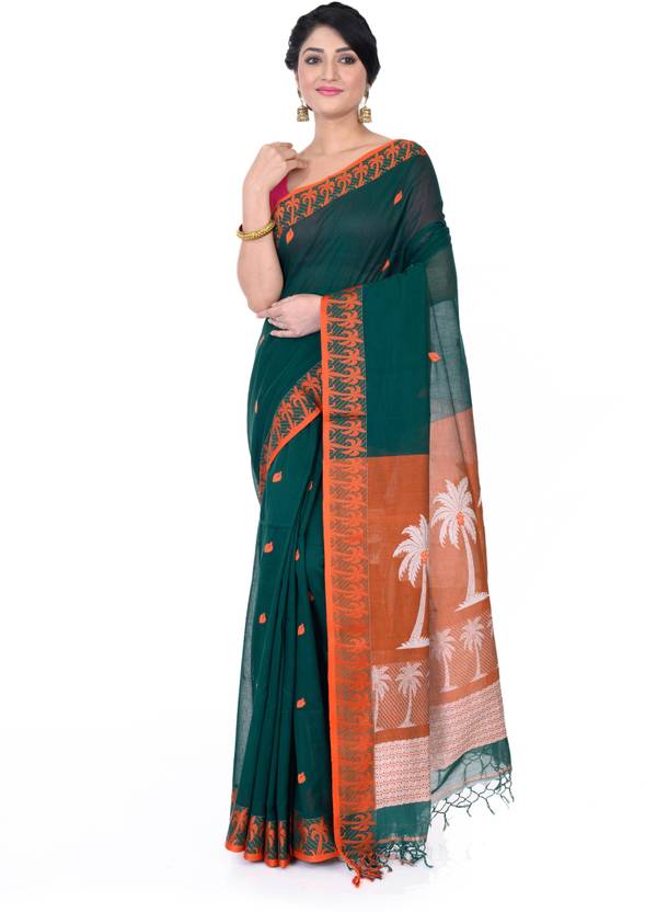 TANTUJA BENGAL HANDLOOM Self Design Tangail Handloom Saree For Women's-Green