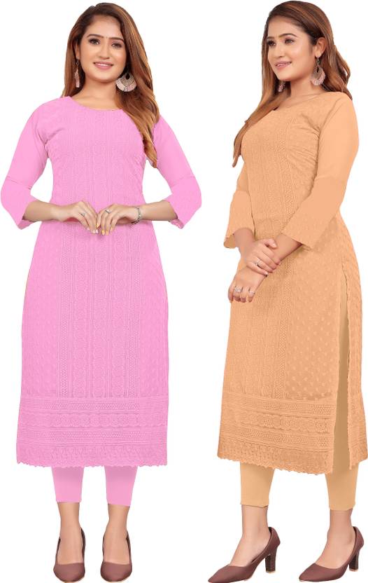 Women Chikan Embroidery Georgette Straight Kurta (Pink, Orange)
