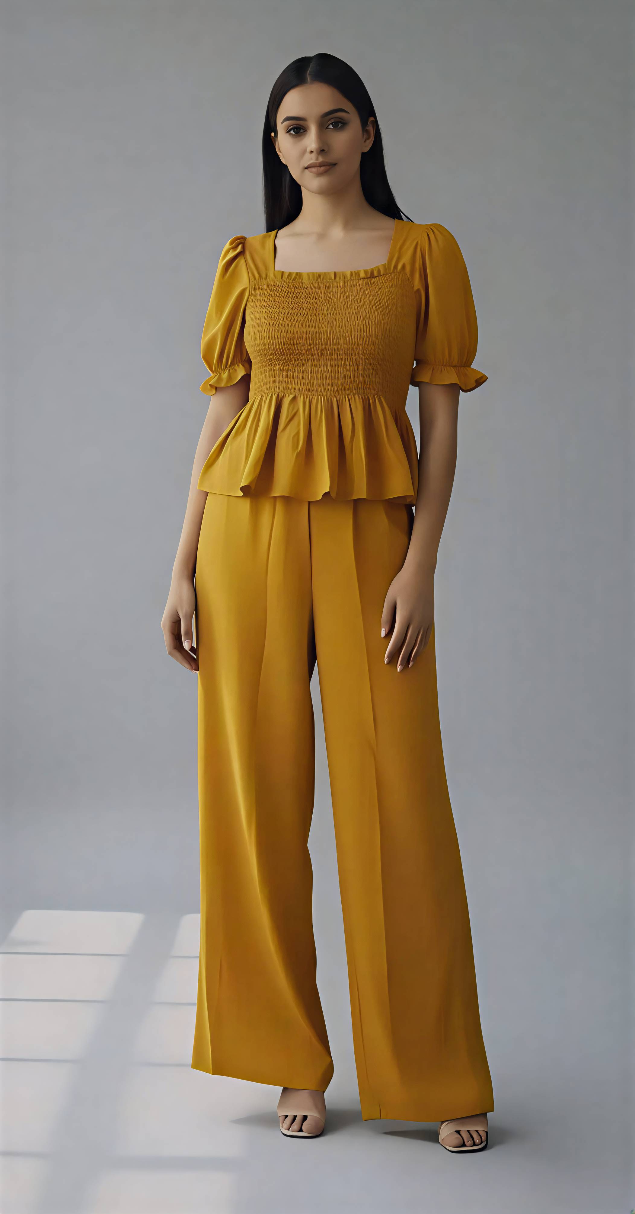 Bring comfort and charm together with this Women Solid Puff Sleeve Square Neck Peplum Jumpsuit, made from a premium cotton blend fabric. The material feels soft and breathable on the skin, keeping you cool and stylish all day long. Designed with a square neckline and puff sleeves, this jumpsuit adds a touch of modern femininity to your look. The peplum waist design creates a flattering silhouette that enhances your natural curves. Ideal for casual outings, brunches, and semi-formal occasions, this outfit is perfect for women who love effortless elegance and comfort in one piece