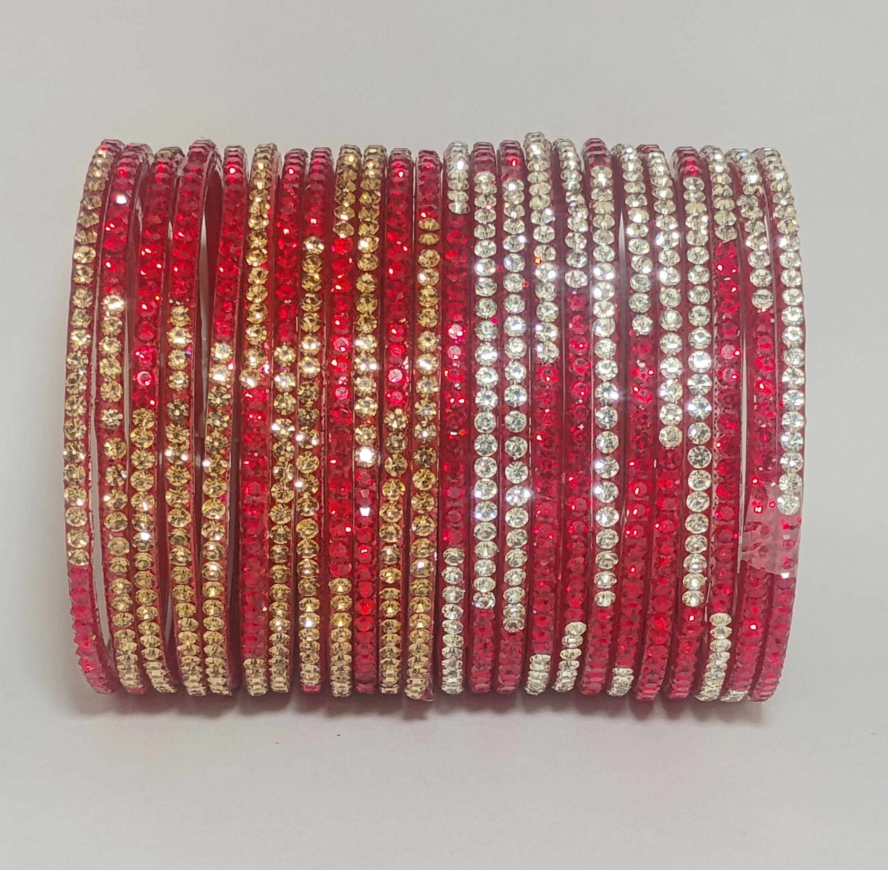 These glass bangles are beautifully studded with shining stones that give a royal and traditional touch to your outfit. Perfect for weddings, parties, and festivals.