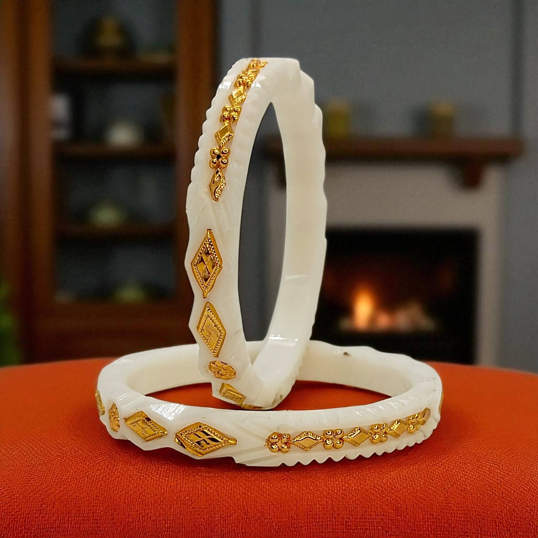 Adorn your wrists with the timeless elegance of the Radha-Rani Sankha Pola bangle set. This exquisite pair captures the essence of traditional Bengali bridal jewelry, reimagined with a modern flair. Crafted from high-quality, lightweight plastic, these bangles feature a striking combination of pristine white and auspicious red. The intricate, geometric patterns are accentuated with a lustrous gold-plated finish, giving them the look and feel of authentic gold jewelry without the hefty price.