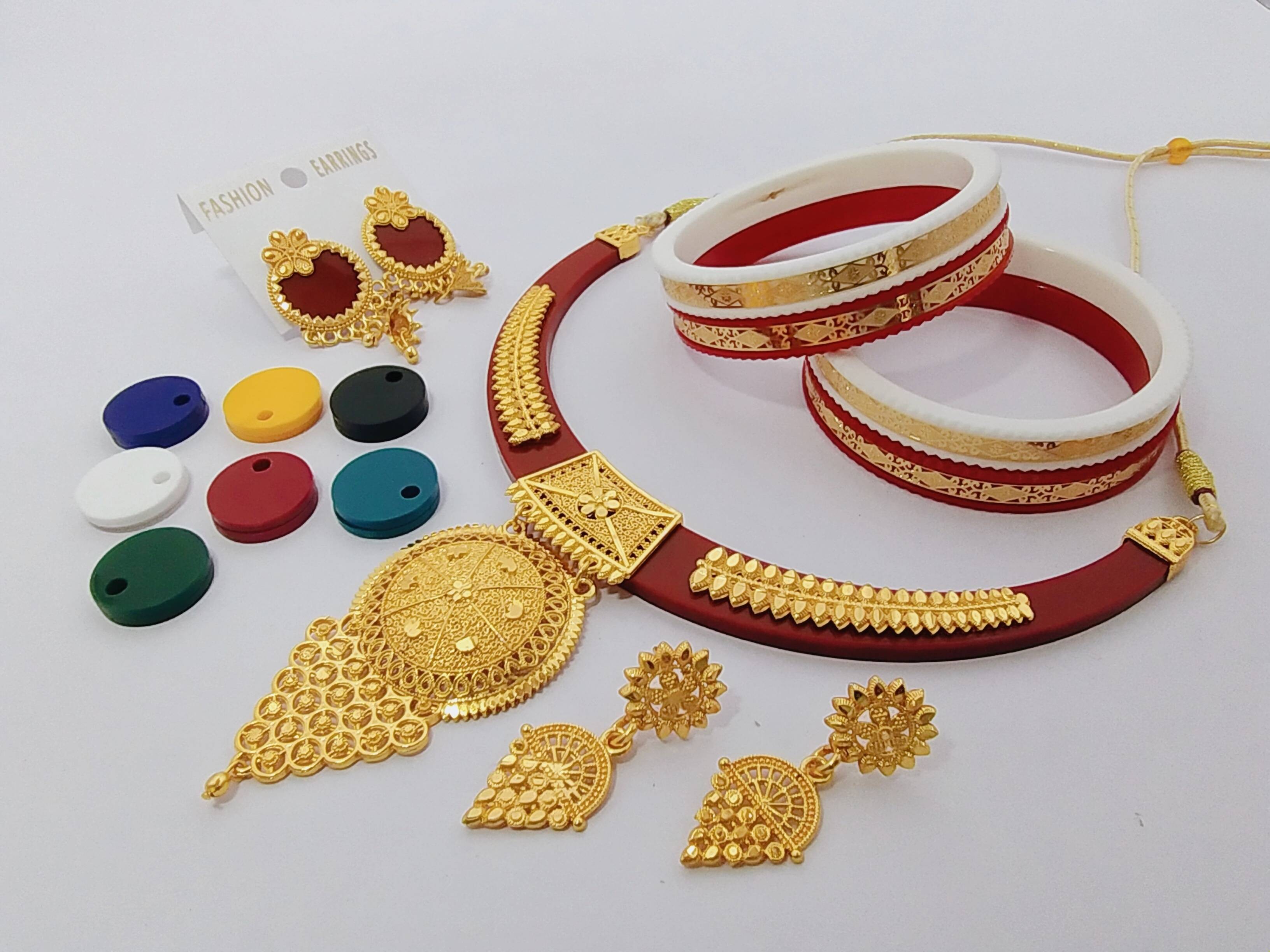 Embrace tradition with this exquisite pair of red and white Shakha Pola bangles, featuring intricate gold-plated Hati Mukh (elephant head) clasps. These auspicious bangles are a cherished symbol of marriage for Bengali women, traditionally worn for their cultural significance and beauty. Crafted from high-quality red and white acrylic with detailed gold plating, this set is perfect for weddings, festivals, and special occasions.