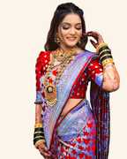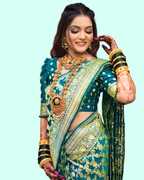 Featuring the classic Paithani oblique square design along with striking motifs throughout the border and base, this saree’s decorative patterns celebrate intricate craftsmanship. Each detail adds depth to its look, making every drape visually rich—a great choice if you want your ensemble to reflect artistic tradition on special occasions.