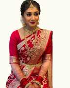 This Banarasi silk saree is thoughtfully crafted to evoke a sense of grandeur and tradition, making it ideal for wedding pheras and other festive celebrations. Its regal appearance ensures you stand out while honouring timeless rituals, perfect for those who seek cultural heritage blended with modern finesse.