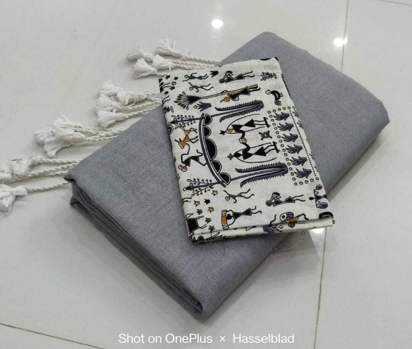 TARAMAACREATION Printed Tant Handloom Pure Cotton Saree (Grey, White)