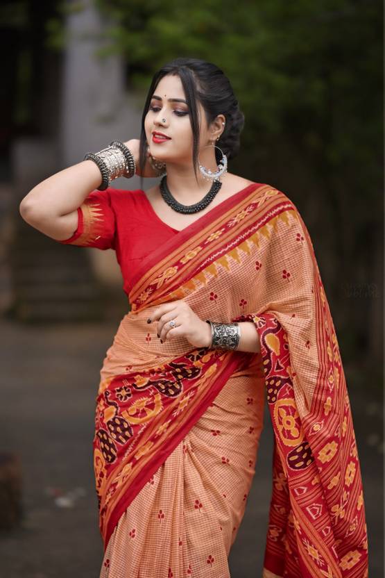 Tareninx Printed Sambalpuri Pure Cotton Saree (Multicolor)