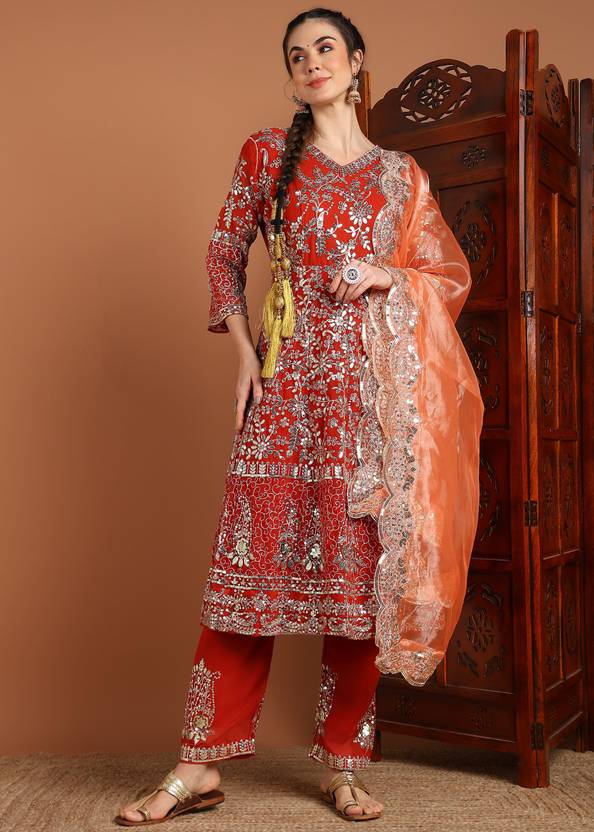 Tasrika Tasrika Orange Georgette Salwar Suite With Dupatta Embroidered Anarkali Kurta, Bottom & Dupatta Set