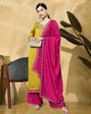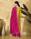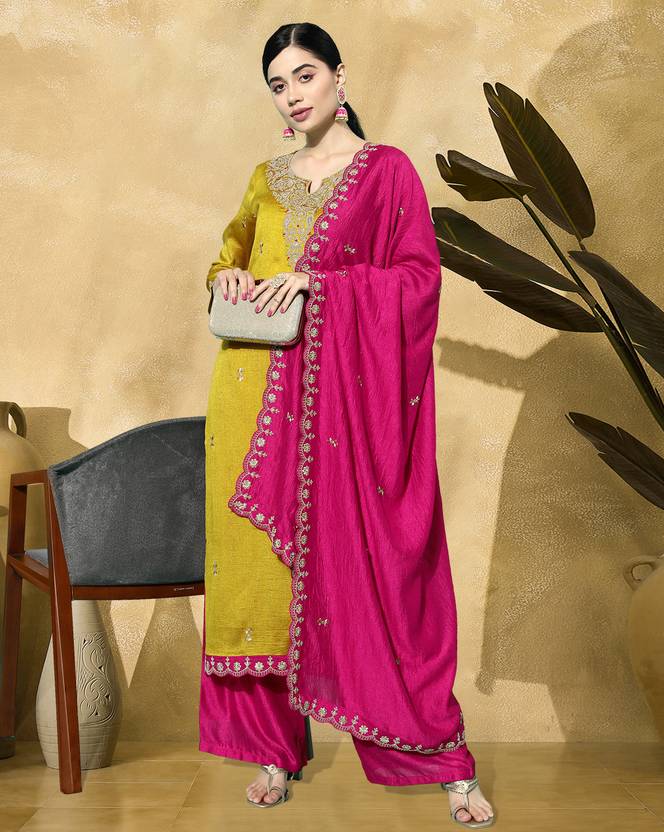 Crafted in soft yellow chinon silk, this set includes a straight kurta adorned with all-over sequin embroidery for a festive shine. The kurta is paired with flowy palazzos that add comfort and elegance. A lightweight dupatta in matching tone with subtle accents adds a finishing touch.