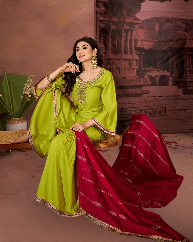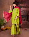 Tasrika Neon Green DChinon Silk Blend Zari Sequence Thread Kurta Sharara Set