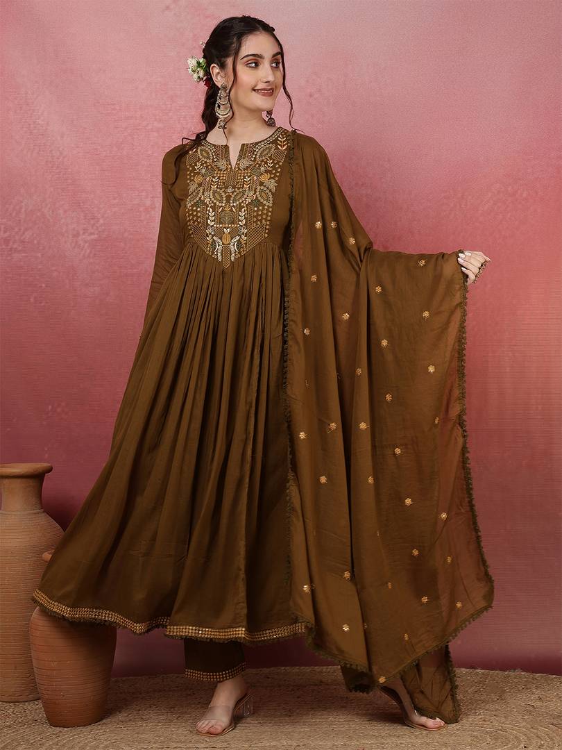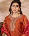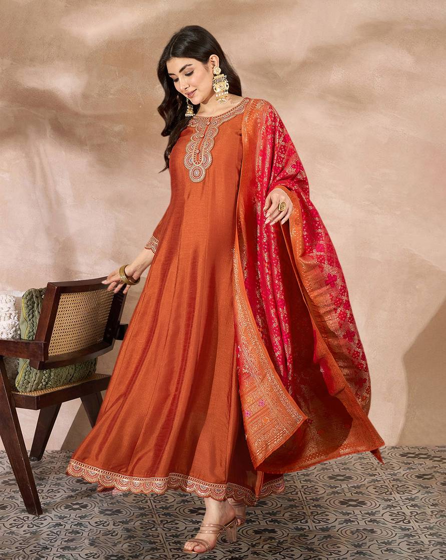 Embroidered Art Silk Stitched Flared/A-line Gown (Orange)