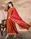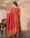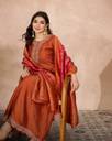 Radiating festive elegance, this Tasrika orange gown is crafted from rich Vichitra fabric that offers a graceful drape and luxurious texture.