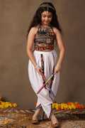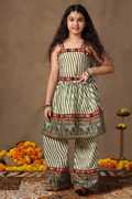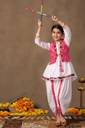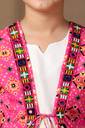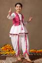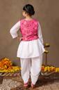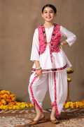 Refresh your wardrobe with this Pink colored Waistcoat,Kurti and Dhoti Set. Get ready your girls for the season of celebrations in this elegant Pink colored Waistcoat,Kurti and Dhoti Set is crafted from Cotton blend Fabric. It is featured Notch neck, 3/4 Sleeve provides a festive look . It comes along with parinted wasitcoat and solid dhoti having fully elasticated waistband for comfortable and easiness. The design adds a touch of cultural flair and sophistication, making it a perfect choice for special navaratri. Pair with subtle jewellery for a beautiful look that's perfect for festivals or family gatherings. "Note: The accessories and props used in these photoshoots are for aesthetic purposes only and may not be included in the final product or service."