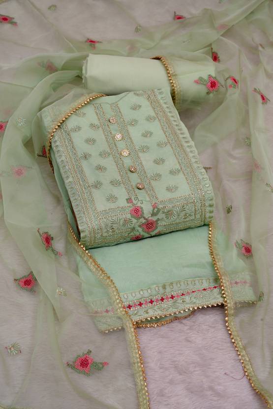 Flaunt yourself by picking these stylish embroidery unstitched dress material from the collection as we presents the exclusive range of hand embroidered unstitched salwar and pant suit material for the women and girls. You can team this dress material with traditional earrings and high heels for gorgeous look. You can also pair it with a pair of earrings and bangles when adorning this outfit for a festive occasion. This attractive dress material will surely fetch you compliments for your rich sense of style. Look gorgeous by wearing this salwar suit dress material with dupatta.