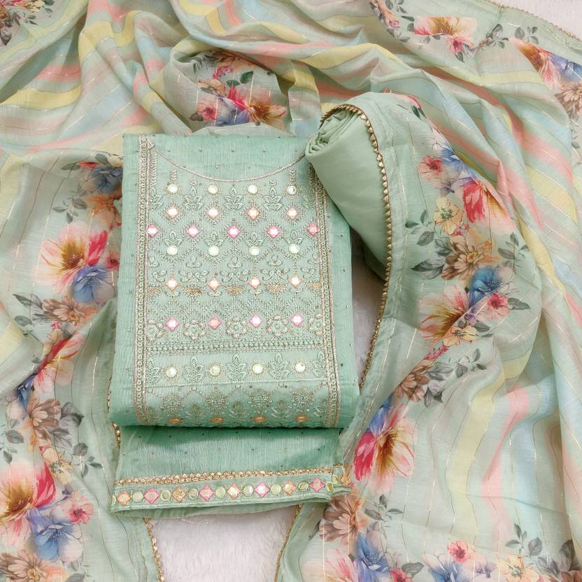 Flaunt yourself by picking these stylish embroidery unstitched dress material from the collection as we presents the exclusive range of hand embroidered unstitched salwar and pant suit material for the women and girls. You can team this dress material with traditional earrings and high heels for gorgeous look. You can also pair it with a pair of earrings and bangles when adorning this outfit for a festive occasion. This attractive dress material will surely fetch you compliments for your rich sense of style. Look gorgeous by wearing this salwar suit dress material with dupatta.
