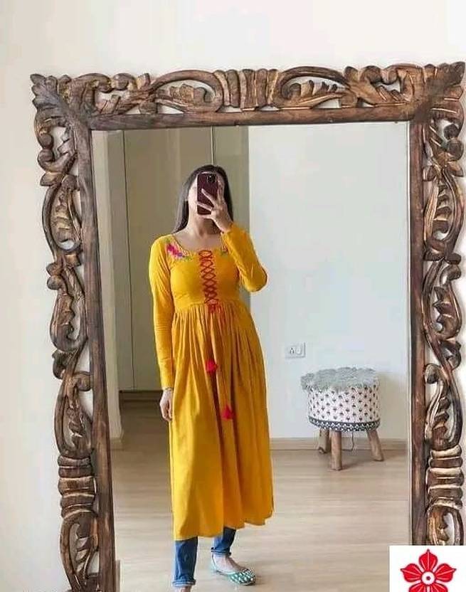 Women Embroidered Viscose Rayon A-line Kurta (Yellow)