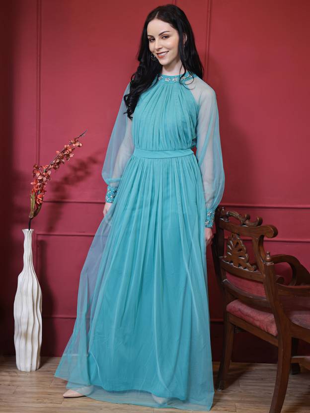 Embellished Polyester Stitched Flared/A-line Gown (Light Green)