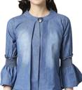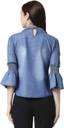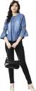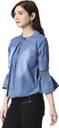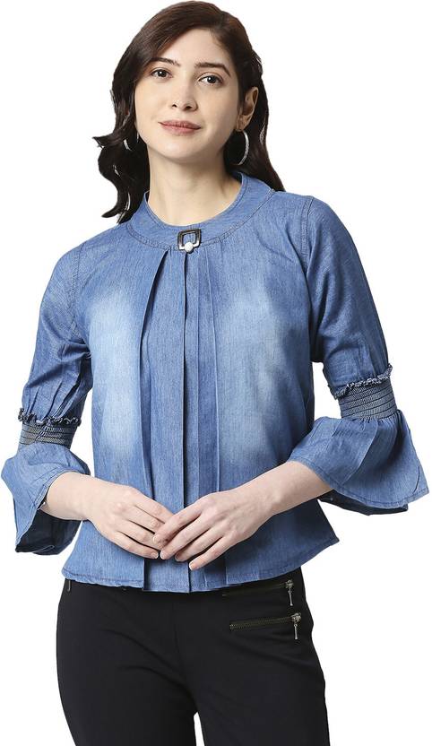 This Denim Tops has round neck with platted design and brooch with beautiful blue Colour around the outfit. This denim tops has solid fabric and 3/4th Bell sleeve. It is tailored in a regular fit. this denim Top for women will keep you comfortable all day long and look Stylest. This is a readymade denim Top so you can wear in all season.