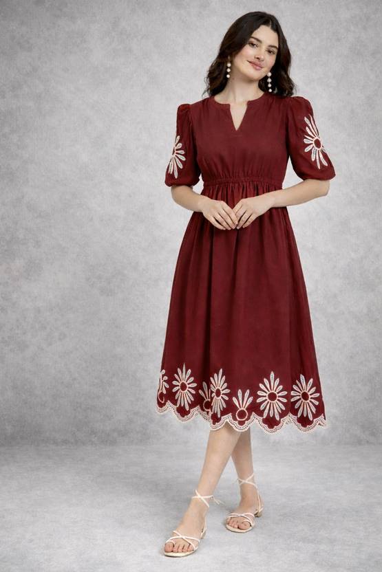 Solid, Embroidered Cotton Blend Stitched Flared/A-line Gown (Maroon)