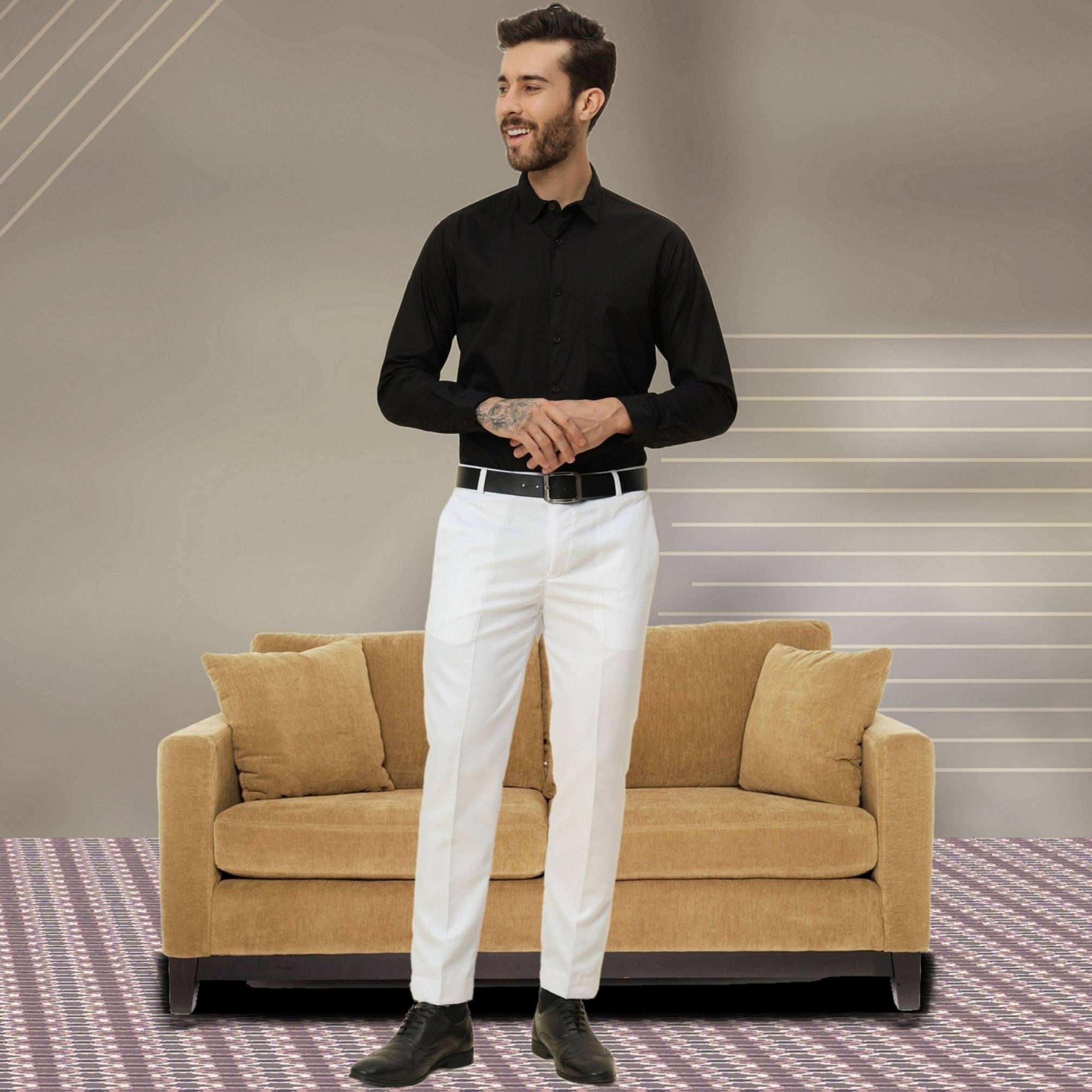 MENS FORMAL TROUSER events and workplaces demand a formal dress code brings to you this formal trouser with a regular fit that can be worn to such places. They are meticulously stitched out of cotton mix material and feel smooth against your skin. The side pockets allow you to comfortably place your palms inside them along with storing wallets and handkerchiefs. The mid-rise waist provides a modern look and the belt loops allow a tighter fit when a belt is slipped through the loops. The button and zip closure is easy to use. You can try on these men’s formal trousers to match your professionalism.