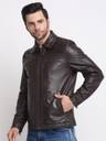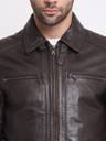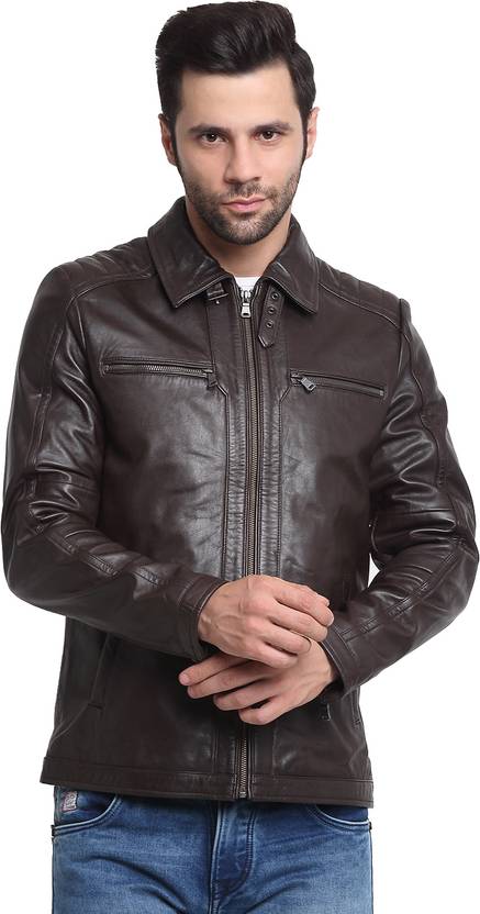 Teakwood Leathers Brown Solid Leather jacket, has a spread collar, 4 pockets ,has a button and Zipper closure, long sleeves, straight hemline, synthetic lining