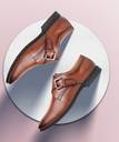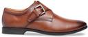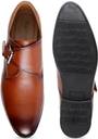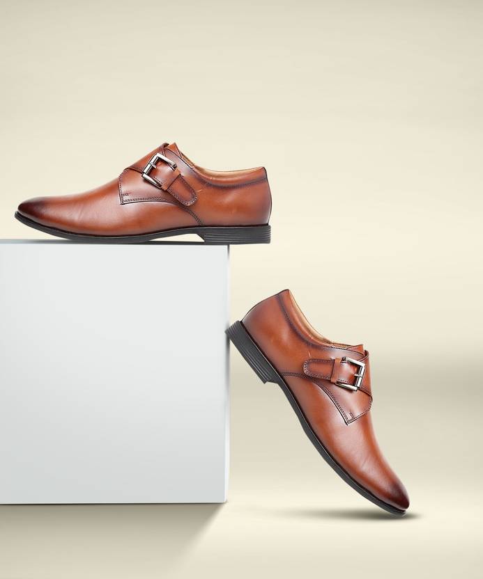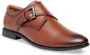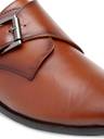 A pair of brown solid pointed-toe formal monks, has single buckle closure, Genuine leather, upper Cushioned footbed, Textured ,and patterned TPR outsole, has a stacked heel, Disclaimer: This product is made from genuine leather which gives it a unique texture, this is why the product you receive may vary slightly from the image.