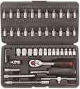 Innovations Socket and Bit Set, 46 Pieces, pulled or pushed in one direction, contains a ratchet that loosens or tightens the bolt or nut attached to the socket. Turned the other direction, the ratchet does not turn the socket but allows the ratchet handle to be re positioned for another turn while staying attached to the bolt or nut.